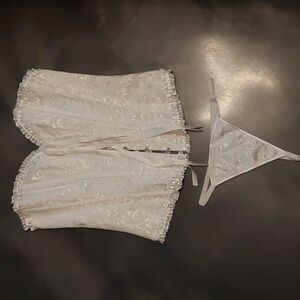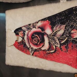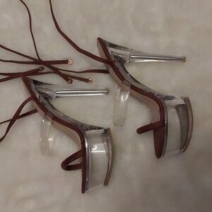 Black and clear platform heels. Translucent black strap across foot. Heel flares out as bottom. Some wear on soles. Platform 3 inches and heel 7 inches