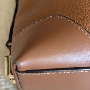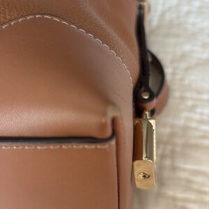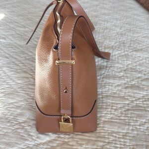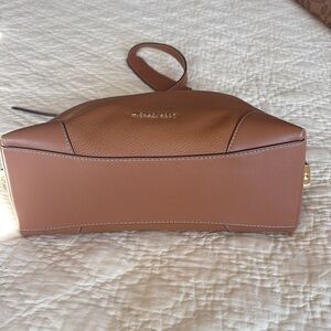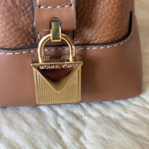Michael Kors British tan crossbody bag. Pebbled leather. 8x12x4. Strap has comfort cushion. Cute gold locks on both sides. Interior has 1 slip and 1 zip pockets. The corners show wear as depicted in the last 4 photos.