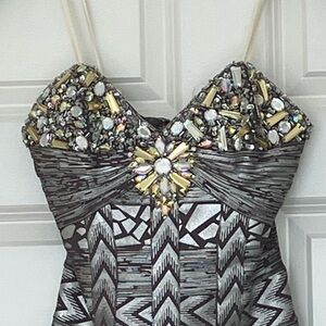 The bodice is heavily embellished with faceted rhinestones, sequins, and glass-style beads, features a structured woven fabric that holds its shape beautifully. Fully lined with a concealed back zipper and delicate spaghetti straps.