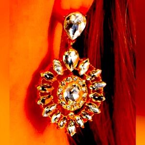 Bordered in dainty white rhinestones, an oval white gem is pressed into the center of an explosion of white marquise cut rhinestones. The icy gold frame swings from the bottom of a solitaire teardrop rhinestone, adding flirtatious movement to the jaw-dropping display. Earring attaches to a standard post fitting.