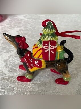 These two towels are each different. One has a picture of Santa with a dachshund walking through the snow that has dashing through the snow printed on it. The second towel in this piece has Santa surrounded by trees, walking in the snow.