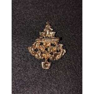 This vintage Christmas tree brooch/pin is a stunning piece of jewelry that will add a touch of nature and fashion to any outfit. The green enamel and yellow gold plated metal give it a unique and antique look, while the round rhinestone adds a sparkling touch. The tree shape and red main stone color make it perfect for the Christmas occasion or any festive event.