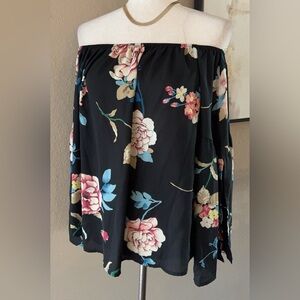 Gorgeous floral off the shoulder floral print top features long split sleeves. Quality polyester material. High end boutique brand Peach Love Ca.