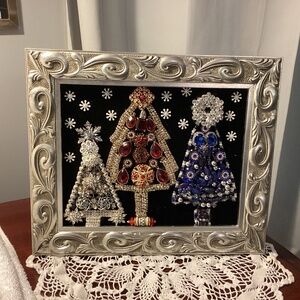 After 12 hours of work… created this Beautiful gown in gold, silver, pearls, necklaces and brooches. The stunning dress is made with layers of chains and gold rhinestone upcycled necklace. A beaded choker with. Pop of rust color appears as stripes. The dress sleeves a repurpose vintage 50's necklace in golden tones with glass beads having splashes of rust and brown and antique gold tones. The Lenox cream ceramic frame helps highlight the fancy dress. There was hours spent in production as the layers have to set before moving to next layer. Everything used was destined for the trash... I said I dont think so!!! This would be a great mantle or tabletop frame. Can also be wall art and would be an awesome office piece to display. Do you have a friend that is hard to buy for and loves jewelry and fancy dresses… this would be the perfect gift!