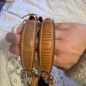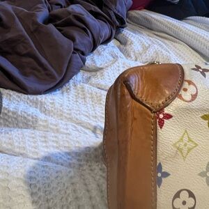 Good condition a bit discolored from normal use creasing on exterior darkening where scuffs and watermarks on leather trim and handles minor wear on interior size large 16.5 length by 10.5 height by 6.5 deep. Dust bag included.