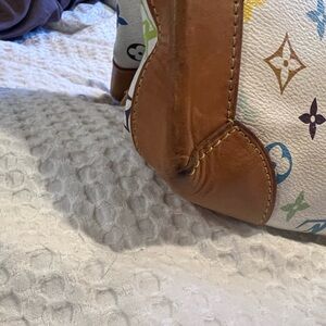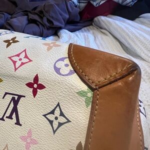 Authentic Luis Vuitton white multicolor URSULA shoulder bag . With red interior.