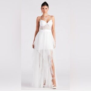 Dial up your inner bombshell in the ravishing Ashlie formal dress to make a dramatic entrance as a sexy bride or a black-tie gala guest! She features a sleeveless sweetheart neckline, adjustable spaghetti straps, a sheer lace corset bodice, and a short skirt lining with a sassy sheer mesh ruffled overlay and a high side slit design to show some skin! Complete the look in this flowy long dress with platform stiletto heels and a necklace.