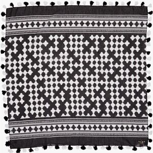 Light and luxurious cotton/silk blend scarf in a black and white print and embroidered with tassels.