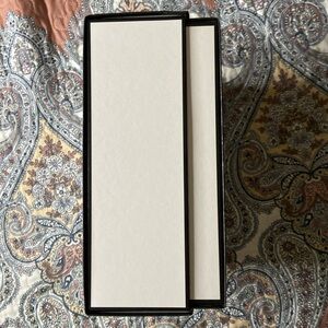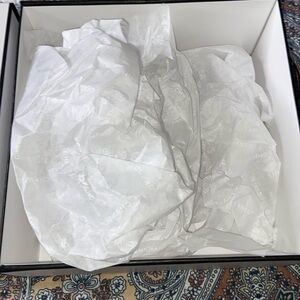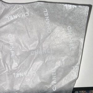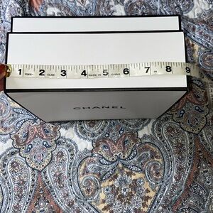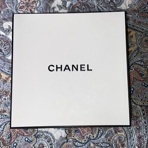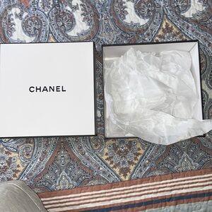 Chanel Gift Box with 3 sheets of Chanel tissue paper. Original. The box is crisp white with black edging. Measures approximately 9”x9”x4”. I can’t keep everything, so selling. If you want the tissue to look new, just iron as we used to back in the 80s when tissue was pricey 😊