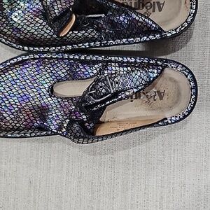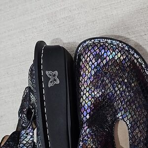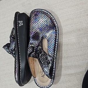 Ladies European size 42 US size 11 slip style shoe. purple tone snake skin looking with sliver stitching & one buckle on the top, very good condition the soles have no wear. inner sokes have very little.