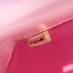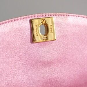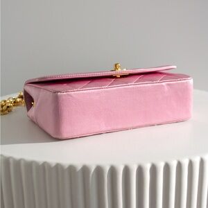 This super rare and adorable mini Chanel Diana bag is a vintage treasure from the early '90s, part of the 1-series collection from 1989 to 1991. It is crafted from luxurious pink silk, beautifully complemented by 24-karat gold-plated hardware, creating a stunning pink and gold combination. The bag features a single flap design with the iconic bijoux chain shoulder strap, adding to its timeless appeal.