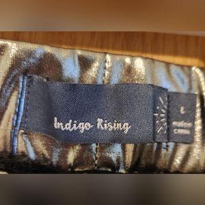 New with tags Indigo Rising Metallic Silver Flare Leg Pants in a women's size Large. Stretchy waist. Black liner inside.
