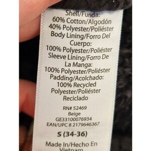 size small. black snap buttons on front, cuffs and pockets.