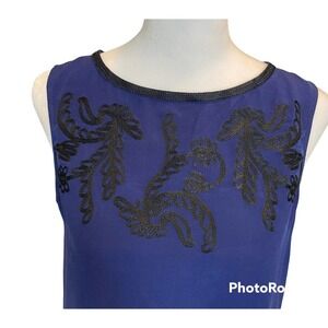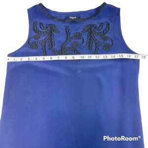 Navy blue tank by Madewell. Black floral embroidery around the top of the shirt reaching from shoulder to shoulder. Black embroidery around the neckline and hem.