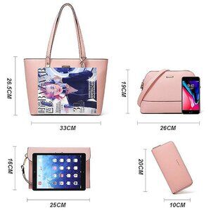 * Size: Large bag:33*26.5*12.69cm(W*H*D), Crossbody bag:26*9.49*19cm(W*H*D), Wallet: 20*10*3cm(W*H*D), Card holder: 10.5*7.5*1cm(W*H*D). Total weight: About 1.05kg. Please you can refer to the size before you buy it. Thank you.