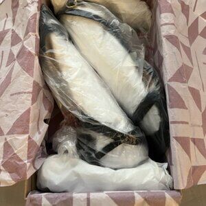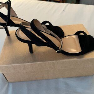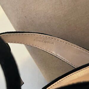 By Anthropologie square-toe black heel with delicate wrap-around ankle strap in EU size 39, fits like US 9 but runs medium to slightly wide, not for narrow feet. Soft black suede, leather upper and sole, made in Brazil. New with box!
