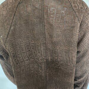 Unbranded brown leather coat, crystal fox fur tuxedo trim, hook and eye and snap closures, 2outside pockets, 1 inside pocket, tag states size small. Measurements are arm pit to pit 26", shoulders 18", sleeves 23" and length 28".