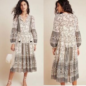 The simple silhouette of this pretty dress features a smocked bodice and puff sleeves. The long loose skirt and square neckline add the finishing touch.