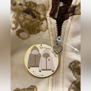 NWT Boutique Reversible Teddy Bear Hooded Sweatshirt. Size girls 7/8. One side is tan patterned with teddy bears, the other is a plush dark brown with one embroidered teddy bear. Both sides are absolutely adorable!