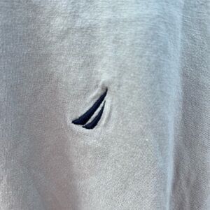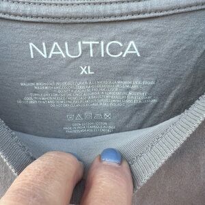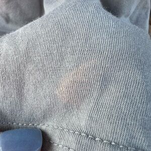 This is a gray short sleeve t-shirt with the blue nautical emblem on top. This is preowned, worn only a few times. Good condition. Only call out is a slight discoloration spot on the bottom in which u cannot really see unless pointed out in the last picture. Price reflects