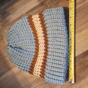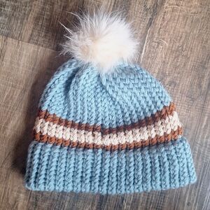 Handmade by myself. These hats are a perfect fit, not too tight or too snug, just perfect. measurements are above. this hat is more of a Teal blue color with brown and cream accents plus a cream colored pompom