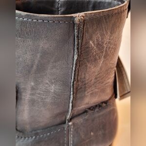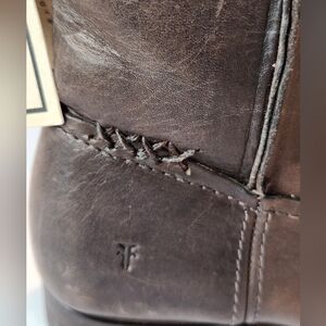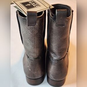 New! Frye Cara boots in a size 7.5. They are a smoke color that goes with anything. (greyish-brown) The leather looks slightly distressed, has some raw seams, and feels very thick. Frye's boots are fully leather inside, outside, and on soles. Handmade. Reg price $288