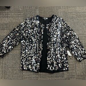 NWT LuLaRoe Elegant Stella jacket in size M. Love the sparkles on this one. I was looking forward to wearing this but I never go anywhere fancy. So fun. There is no stretch to this one. Perfect for NYE. Help me clear out the closet.