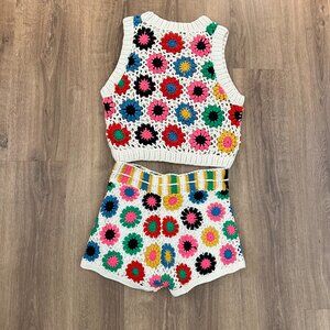 How darling is this set?!?! Crochet circles in multi colors for a fun pop of color. This set is super soft cotton yarn. The shorts are fully lined and have a drawstring. Wear them separate or together.