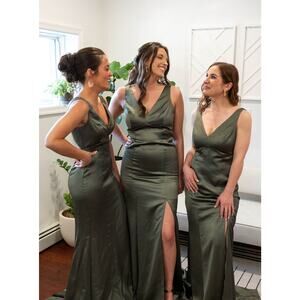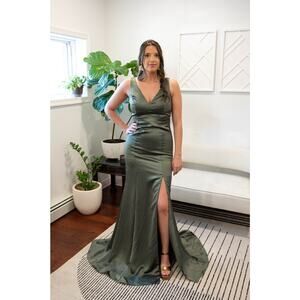 Satin v-neck dress with triangle empire waistline, princess seams, open back with elegant button details, fit and flare skirt with slit at left leg