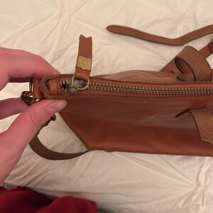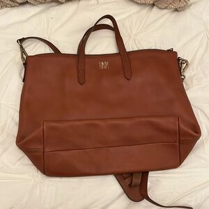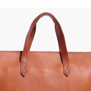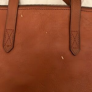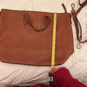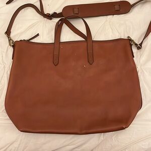 Madewell Transport Satchel in English saddle leather. Sold out online and in stores. genuine leather brown tote bag with detachable crossbody strap. Does have gold letting done with my initials. Great condition decides 3 marks to the leather on the back of the bag in between the handles