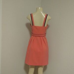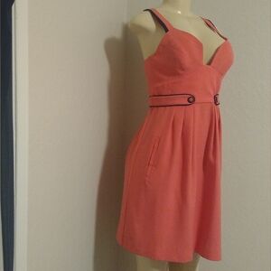 This orange and black dress features a bustier design with small straps for fashion distinction, sealed imitation bosom pockets on the sides below the waist, and an A-line shape skirt.