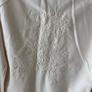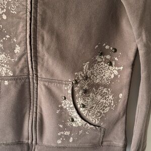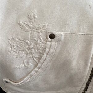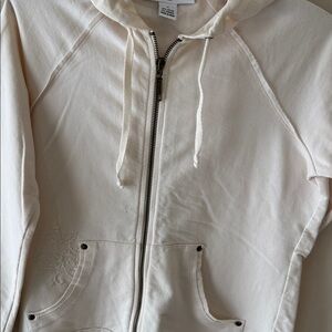 • Style & Co. Petite Sport beige hooded jacket with 2 pockets. Embroidery floral in back.