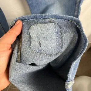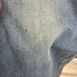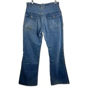 Flaws: These look like they're from the 70s--lots of character. Patches covering holes on the bottom of the pants legs, a small stain on the thigh, mismatched buttons on the bum flap pockets, distressing in certain areas like on pockets,