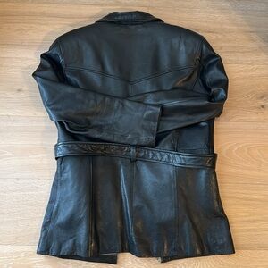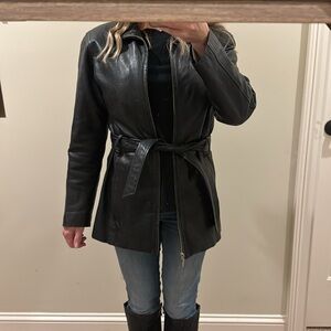Pelle Studio, Wilson’s Leather Black Mid-Length Jacket with Belt, Size Small. Has removable Thinsulate Thermal Insulation layer. Excellent condition. Two deep pockets. Perfect Fall/Winter jacket. Stylish, warm.