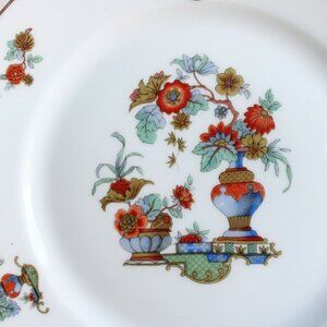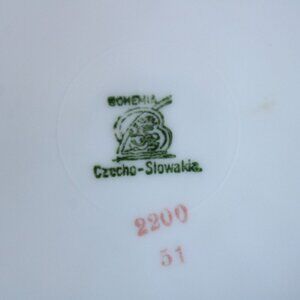 Charming vintage lunch or bread plate by the Bohemia Ceramics Works of Czechoslovakia. The plate is circa the 1930s as the company was in operation from 1921 to 1945. I was unable to pinpoint the pattern but is marked with the numbers 2200 and 51 on the bottom as well as the makers mark. It's a white background with a center pattern of florals in vases in rust oranges blues and greens edged with gold. It measures just under 7".