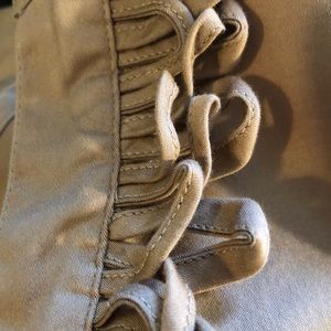 Color is a safari tan with a back zipper entry and sleeveless style. V neckline has pretty fabric loops all around to create a great frame! Cotton/ spandex blend in a woven fabric with fabric belt. Bust measures approx 19 inches flat across and center back length is approx 36.5 inches.