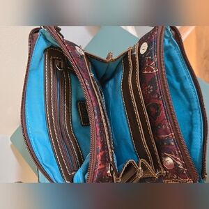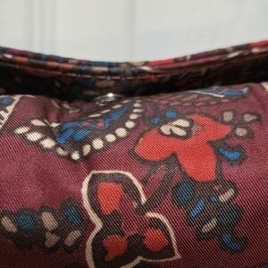Chaps crossbody purse with adjustable brown faux leather shoulder strap, nylon jewel tone paisley fabric (Burgundy, red, deep turquoise, tan), silver tone hardware. Tons of compartments, some zipper closures, some magnetic snap closures, outside compartment with magnetic snap closure. Turquoise fabric lining. 8" W, 7 1/2" H, opens to about 3" deep. Adjustable strap goes from 20-24 inches in length. Great condition. Perfect for the holidays with the rich jewel tones.