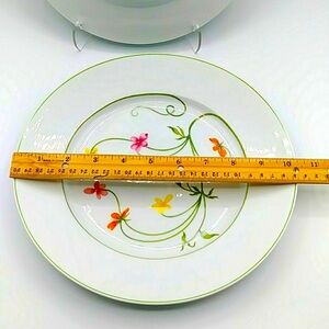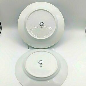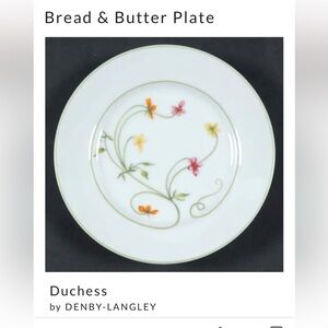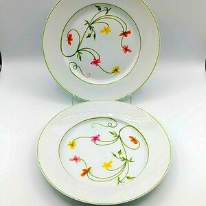 2 Denby Large Dinner plates in the pattern called Duchess. Each plate has a thin fine outline of green on the outside of the White plate and decorated in the center with whimsical flowers. Bright colors, high gloss, very little signs of use. Each plate is numbered differently and they were made in 1974, in portugal. Denby is a well-known manufacturer of fine china.