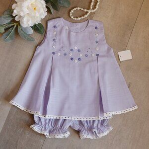 This Vintage Style Newborn Diaper Set is Beautiful!! The UNIQUE set is done in a cotton/poly blend in a sweet Cloud Blue. The lightweight fabric is perfect for warm weather. Neckline, hem & arm openings have a sweet Soft-White embroidered scalloped trim. Front of the top has a wide embroidered mesh lace with scalloped edges, complimenting the other lace trim. A fly-away back has a single button closure. Matching bloomer/diaper cover has a smocked waist with a ruffle hem top. The legs gather with elastic and have a ruffle hem. Sweet mesh tulle bows done in Ecru are attached on each side of the leg openings-unique feature! Matching bonnet has the same embroidered scalloped trim around the face and bottom and has a single pleat on each side. Ecru mesh tulle streamers tie into a bow. An adorable matching Ecru tulle bow is attached to the back bottom of the bonnet. This is the most PRECIOUS diaper set I have seen yet! A fabulous Boutique set from Europe. Brand New Without tags. Perfect for first portraits!! Makes a Special Baby Shower Gift also!