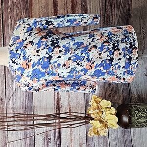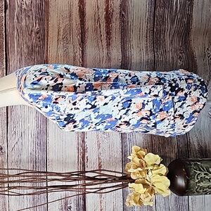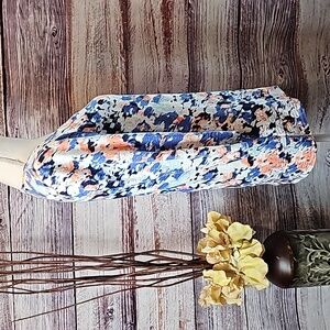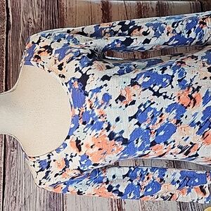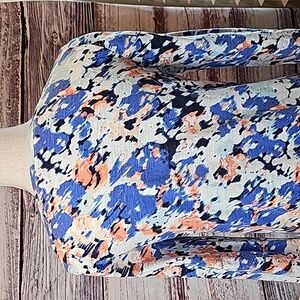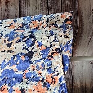 Chico's, blues, and oranges in an abstract print, cotton-blend, 3/4 sleeve, scoop neck, crossover slub tee.