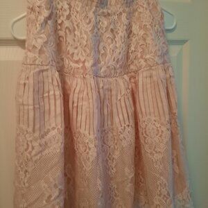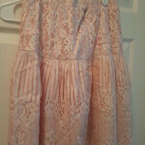 This elegant bright color peach color skirt is beautifully designed with lace for any occasions. Skirt has elastic at waist line and nicely lined. Offers are welcome. The bright peach color is not shown in the photo. The color is much lighter.