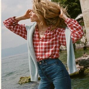 Charming redish orange and white linen gingham dress. Features a flattering waist tie and a classic pattern.