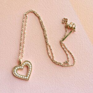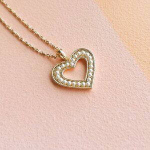 The Charlotte Collection offers an expression of affection with this pearl-encrusted heart necklace, elegantly plated in 18K gold. Each pearl is meticulously placed, tracing the outline of the heart in a display of refined beauty. The delicate chain with its subtle twists complements the pendant, creating a piece that whispers sentiments of love and sophistication.