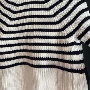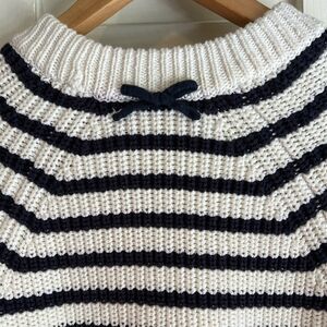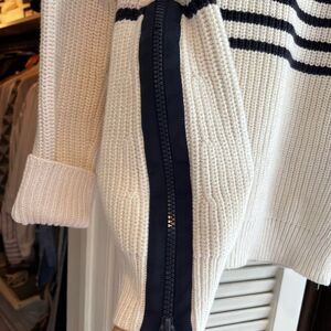 Channel your Parisian chic with this adorable Kate Spade sweater. Chunky knit 100% cotton and a perfectly sized striped accents. White ivory background with navy stripes. Two navy side zippers with grosgrain ribbon trim. Cute small navy bow at back of neck. Very good preloved condition - one missing bit from zipper on left side (it’s towards the top and doesn’t impact the zipper function) and some slight fading on the stripes at the back (see pictures).