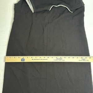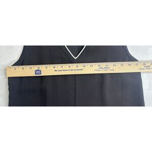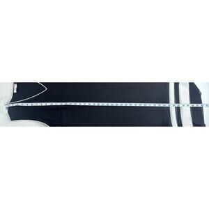 Midi length shirt dress, black with layered black and white striped hem, v-neck with white trim, sleeveless.