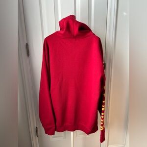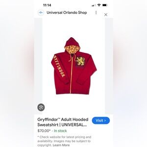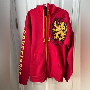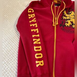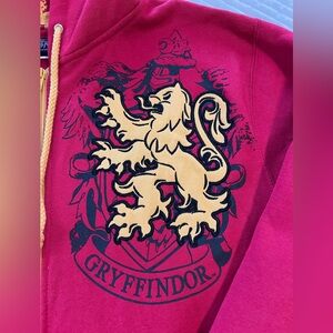 Purchased at Universal Studios. Adult small. Harry Potter Gryffindor hoodie. Zip up. Front pockets. Logo design is embroidered and screen print. Sleeve is screen print. Chess pattern material inside hood. Worn once.