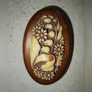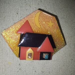 1 1/8 × 1 5/8 in size. goldtone amber resin & rhinestone brooch. pre owned excellent condition. beautiful accessory to any collar,sweater,hats, scarf
