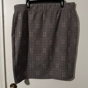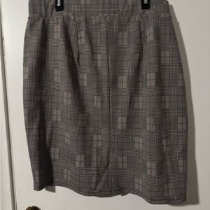 A professional knee-length pencil skirt in gray with a subtle plaid pattern, made from a structured suiting material and featuring an elasticized waistband for comfort.
