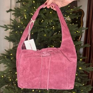 New with tags viral Lucky Brand Clem suede shoulder bag with bow in color Grapevine / burgundy.