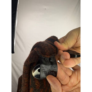 This pre-owned MOTH by Anthropologie coat is a size L petite. It features a herringbone pattern in shades of brown and dark orange. The coat has a relaxed fit with three-quarter sleeves, a single button closure, and side pockets. The material is a medium-weight wool blend, and the construction appears to be of good quality. The color is consistent throughout, and the pattern is clearly defined. New with Tags and retails for $198